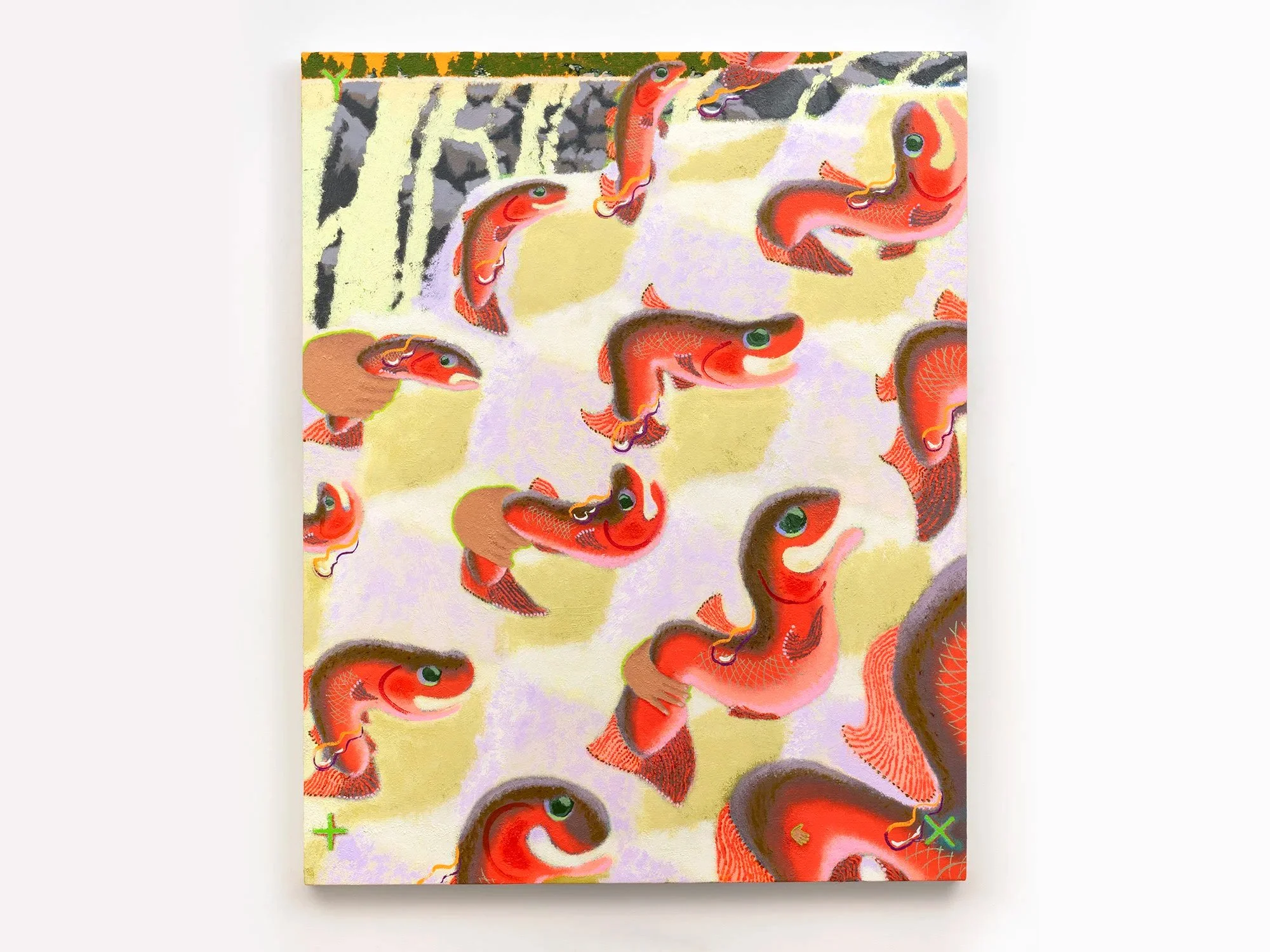 JF: That painting incorporates a grid. The phenomenon that I'm trying to illustrate with the painting is that of moving goalposts–where the thing that you're trying to grasp is a little bit out of reach. That's why the hands get smaller, and the fish get bigger in the painting. [1]