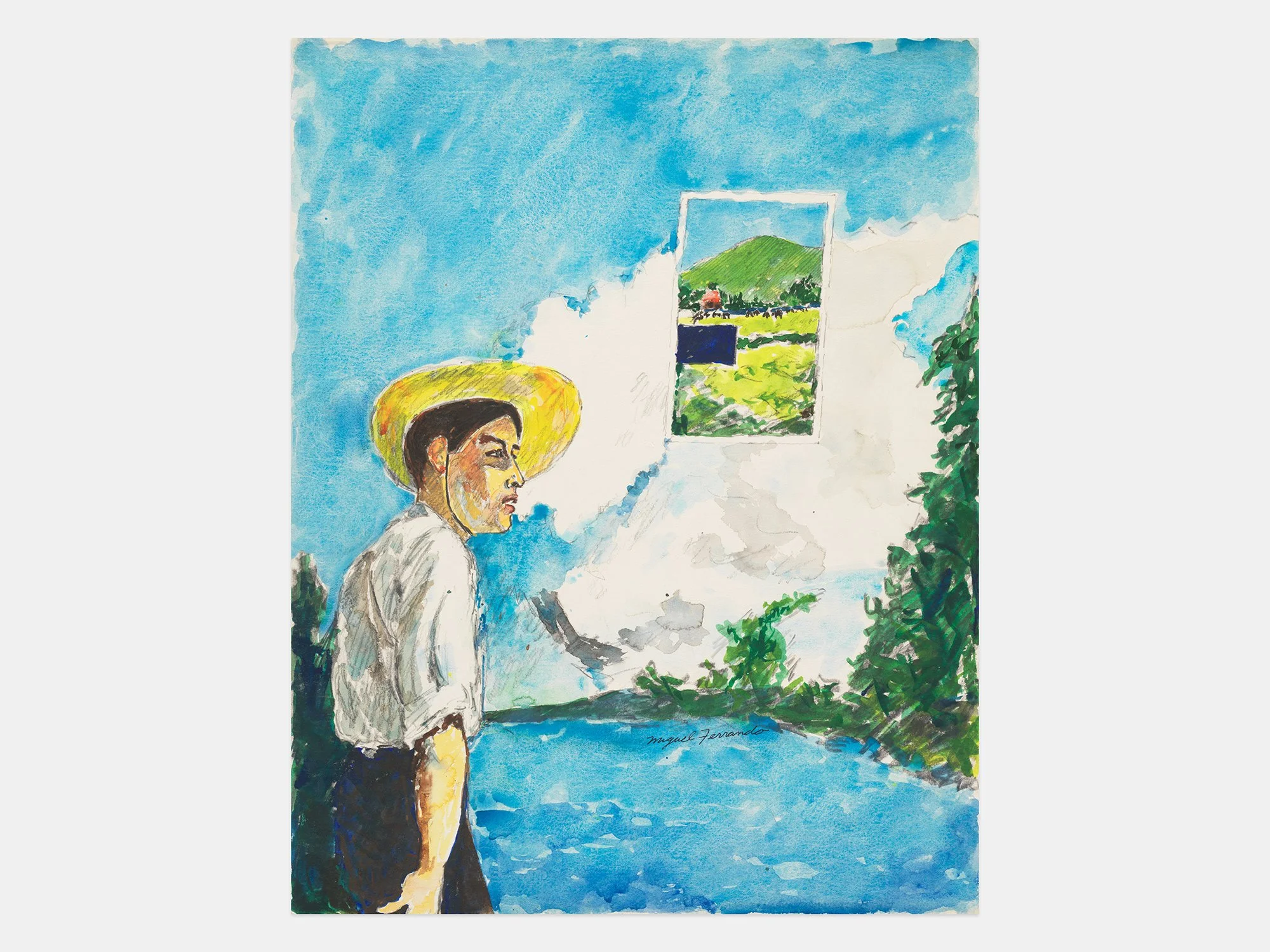 Born in Santo Domingo in 1957, Ferrando moved to New York at the age of five but returned frequently to the Dominican Republic, where the city and its culture remained central to his practice. His palette was shaped by the tropical light and lush vegetation of the Caribbean, and frequently incorporating a postmodern mélange of cultural motifs. At times, his work addressed the tension between inherited colonial structures—encountered at the Escuela de Bellas Artes, where he trained, and in the architecture of Santo Domingo—and his deep love of European painting traditions, with echoes of Velázquez, Goya, Manet, Cézanne, Turner, and El Greco emerging throughout his work. Over two decades, he created a distinctive style that shifted effortlessly between genres with a deft handling of watercolor, as presented in this exhibition, as well as working in oil, graphite, and collage.