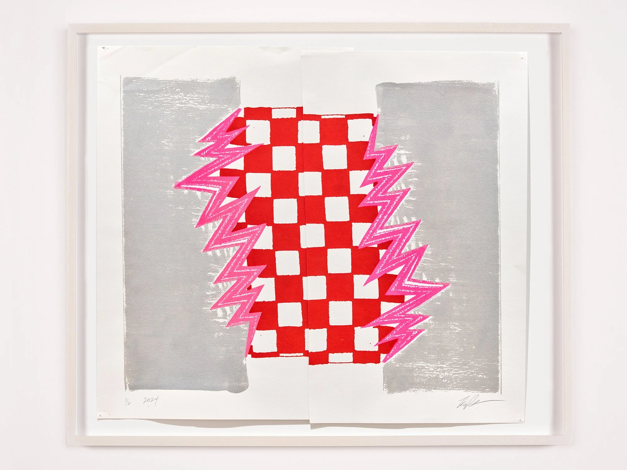 Electric Checkers employs Liz Collins’s signature use of bold colors and graphic patterning, exemplified here in a unique screen print on paper. Collins discusses her inspiration in a video produced by the National Gallery of Art in concurrence with the exhibition Woven Histories: Textiles and Modern Abstraction, which travels to MoMA in April of 2025.
