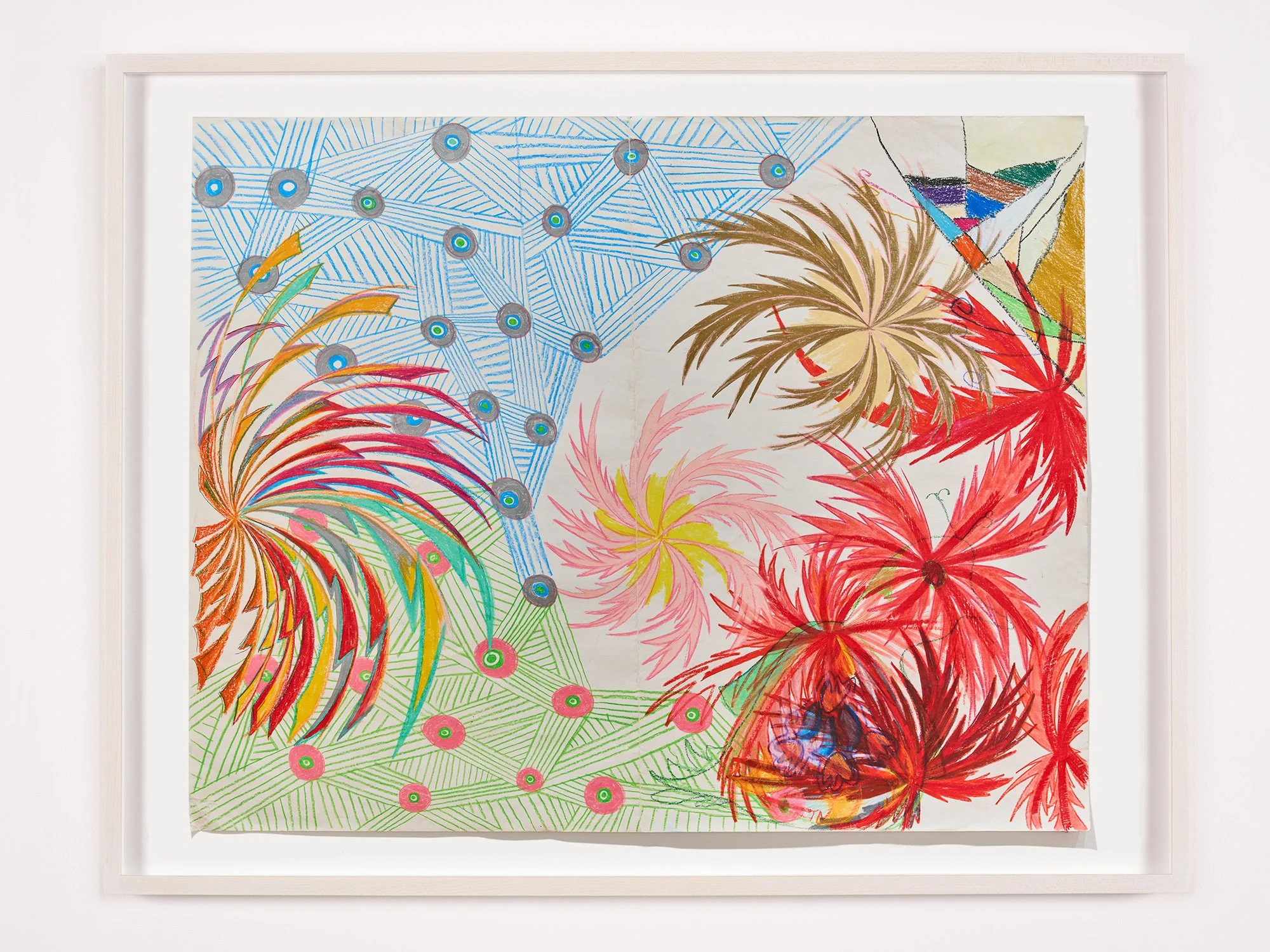 Liz Collin's language of abstraction alludes to queer and feminist references, sourcing inspiration from interpersonal and environmental forces such as electricity, volatility, connectivity, and energy exchange. Pandemic Flowers depicts a vibrant and imagined garden, created during the COVID-19 lockdown.