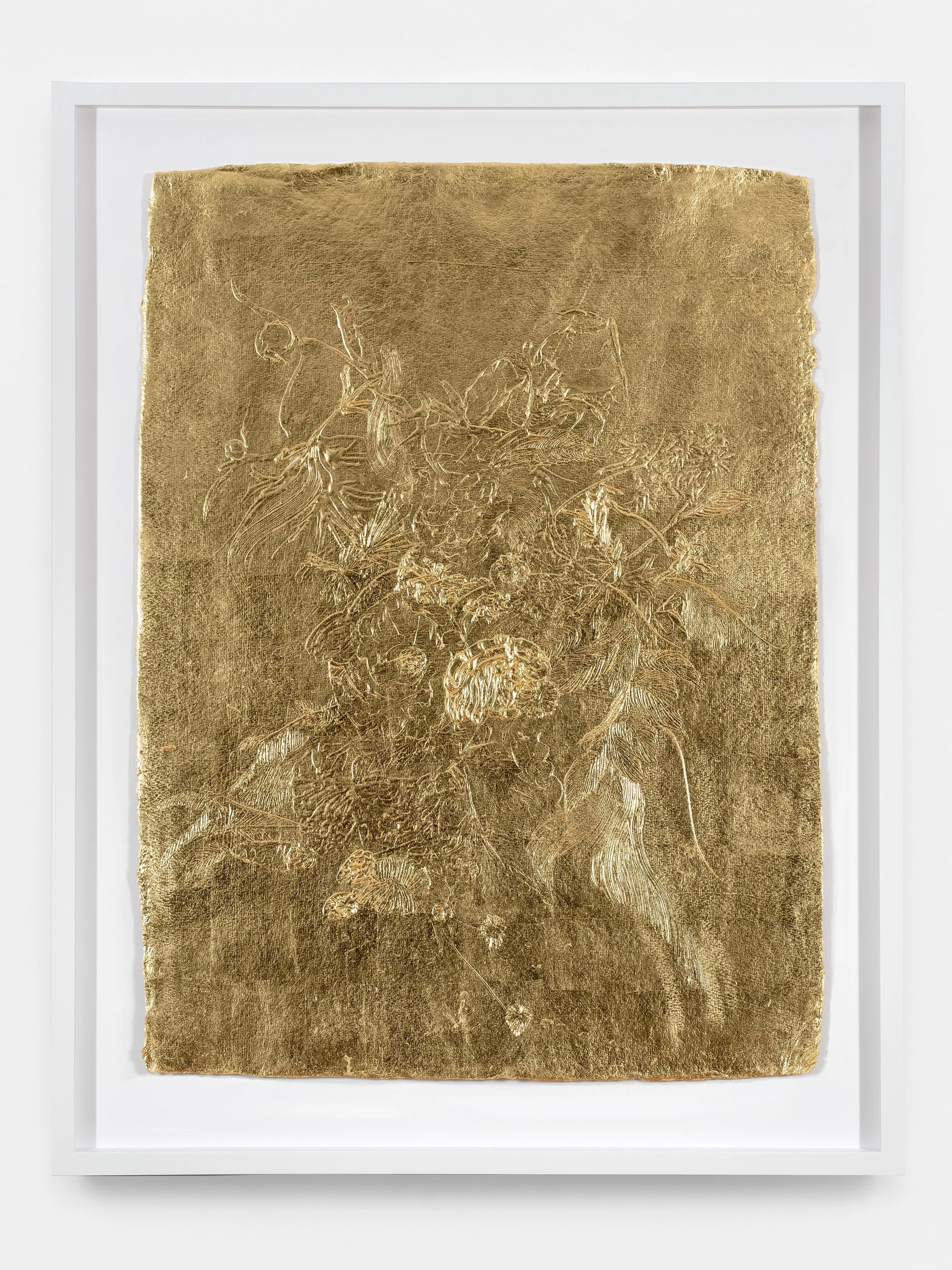 Stacy Lynn Waddell explores periods described as the “Golden Ages” in history. In a series of florals, she considers 17th century Dutch vanitas and pronkstillevens painting—art work created alongside the birth of global trade, corporate finance, and central banking systems. Constructing images in relief and using traditional gilding processes, her works consider the authorship and idealism of art historical narratives and how they correspond to the economic and political structures of their time. This work recently toured as part of the Weatherspoon Art Museum's excellent exhibition Gilded: Contemporary Artists Explore Value and Worth.