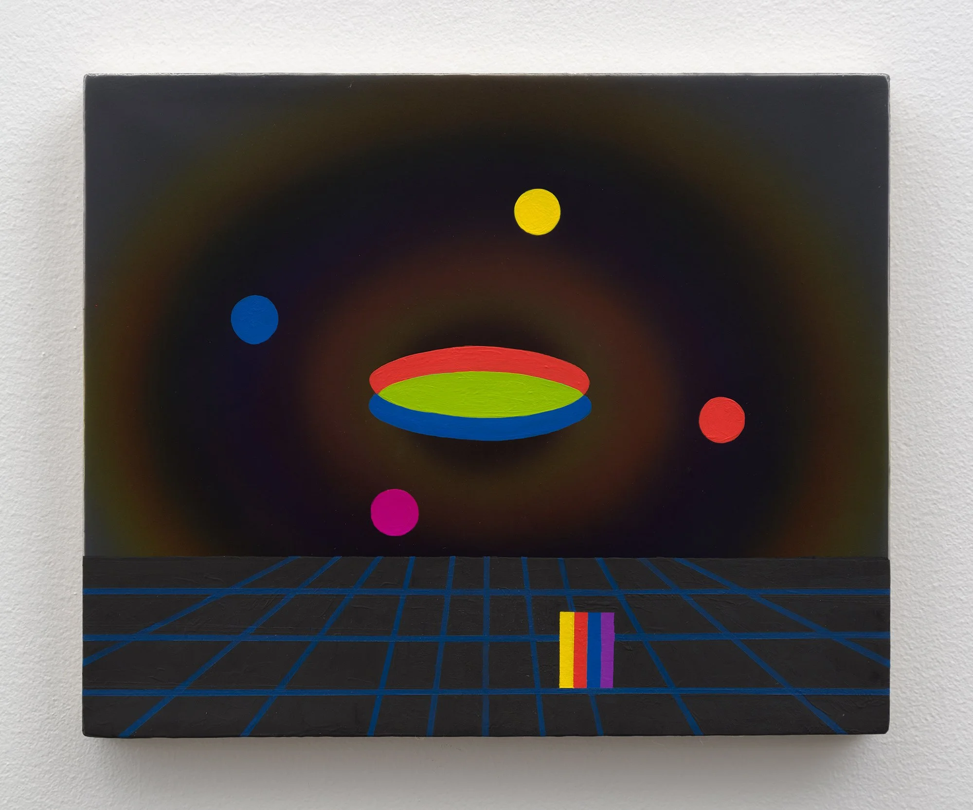 Adam Henry’s work is often informed by the systems of visual and oral languages, evident in his use of recurring geometries, optical color play, and enigmatic circular references. Recent paintings, such as Protocol, present abstracted, fantastical compositions that refer to land, sky, gravity and time.