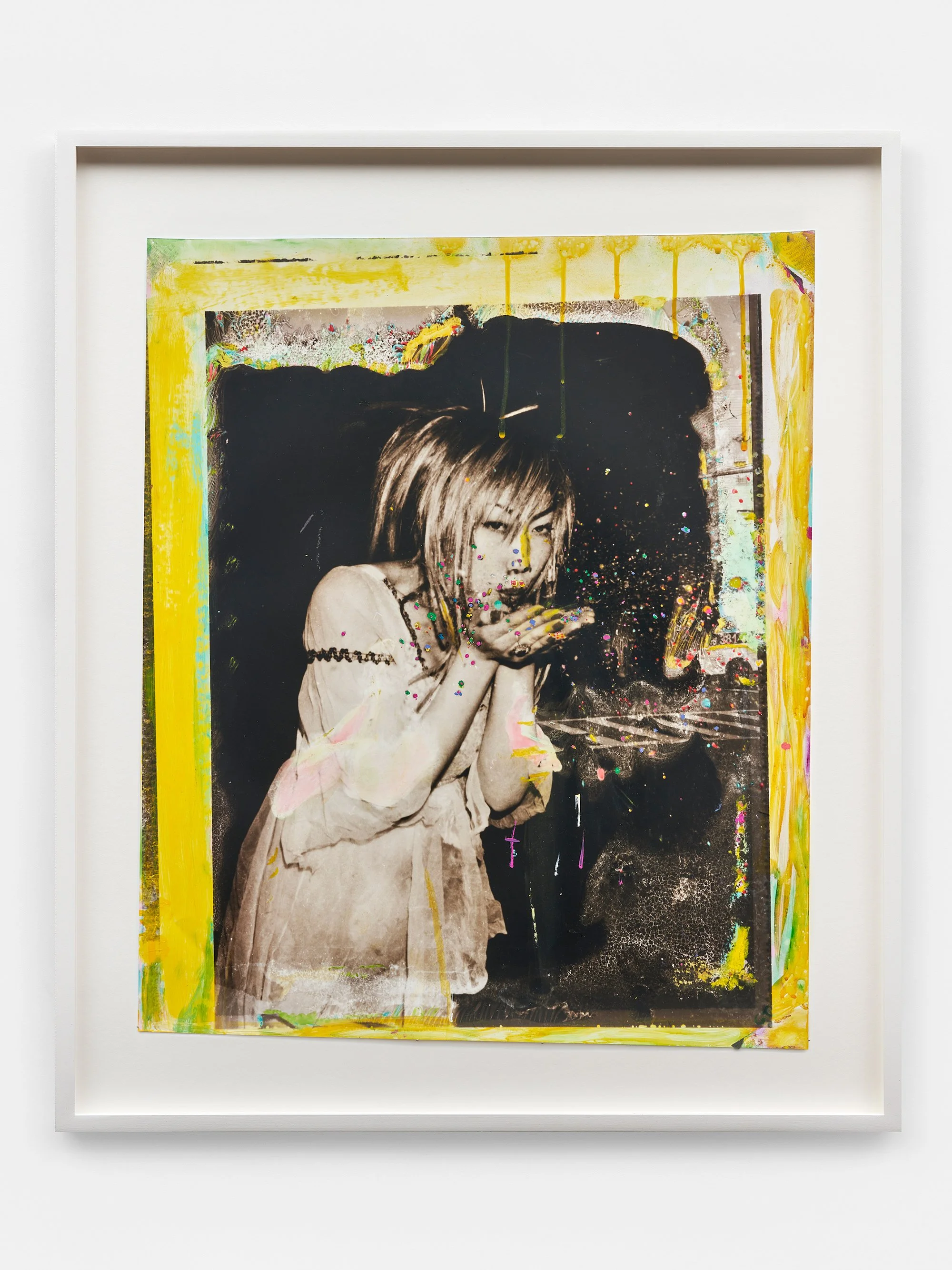 Gail Thacker’s divergent approach to photography involves subjecting images taken with Polaroid 665 positive-negative film to experimental chemical processes that encourage the negatives’ decay, revealing in material form the artist’s metaphysical views about temporality and the transience of lived experience–a process she began in the 1980s at a time when she lost many friends to AIDS. Photos are often overlaid with painting or stitching, as seen here, and include friends, lovers, and performers at the Gene Frankel Theatre on Bond Street in Manhattan, which she directed for over 20 years.